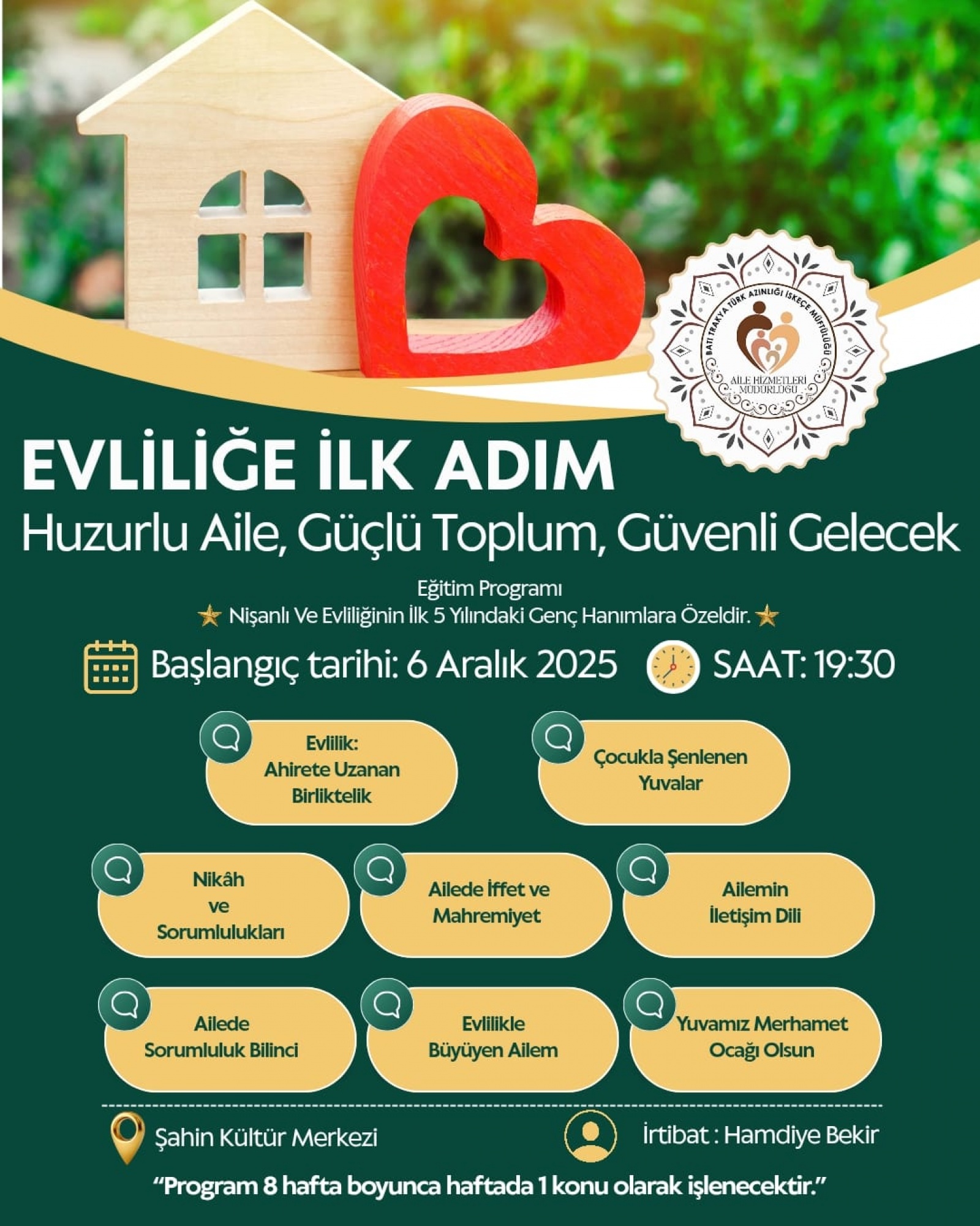 Batı Trakya Türk Azınlığı Danışma Kurulu Başkanı ve İskeçe Müftüsü Mustafa Trampa’nın öncülüğünde, İskeçe Müftülüğü Aile Hizmetleri Müdürlüğü tarafından “Evliliğe İlk Adım Eğitim Programı” hayata geçiriliyor. Program, evliliğin ilk beş yılında olan kadınlar ile nişanlı genç kızlara yönelik bir bilinçlendirme ve destek çalışması olarak tasarlandı.