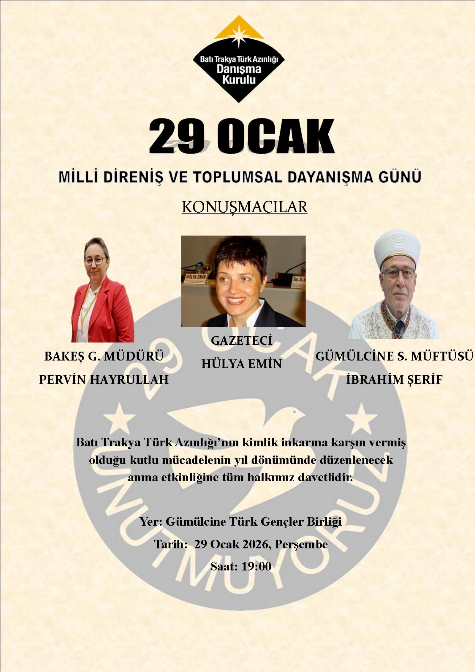 Anma etkinliği, 29 Ocak 2026 Perşembe günü saat 19.00’da, Gümülcine Türk Gençler Birliği lokalinde yapılacak.