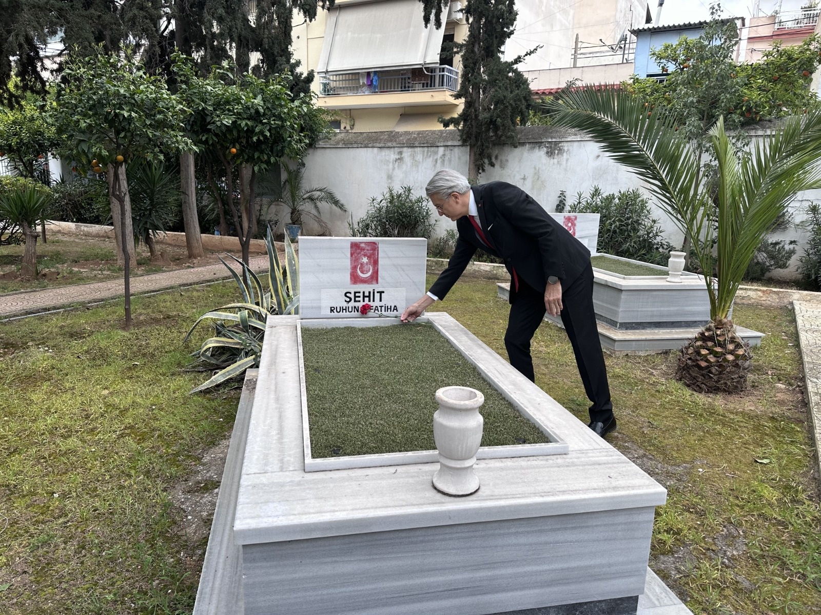 Konuşmanın ardından Büyükelçi Erciyes, şehitlik defterini imzaladı. Tören, şehit kabirlerine beyaz ve kırmızı karanfiller bırakılmasıyla sona erdi.